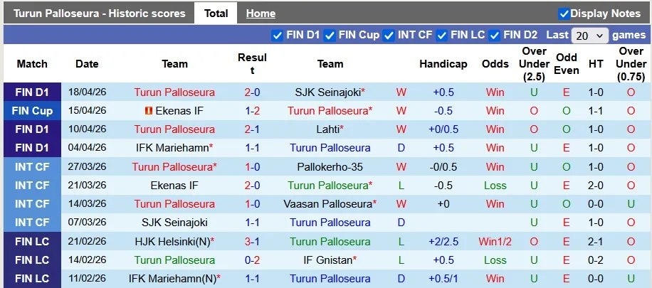 Thống kê phong độ 10 trận đấu gần nhất của Turun Palloseura