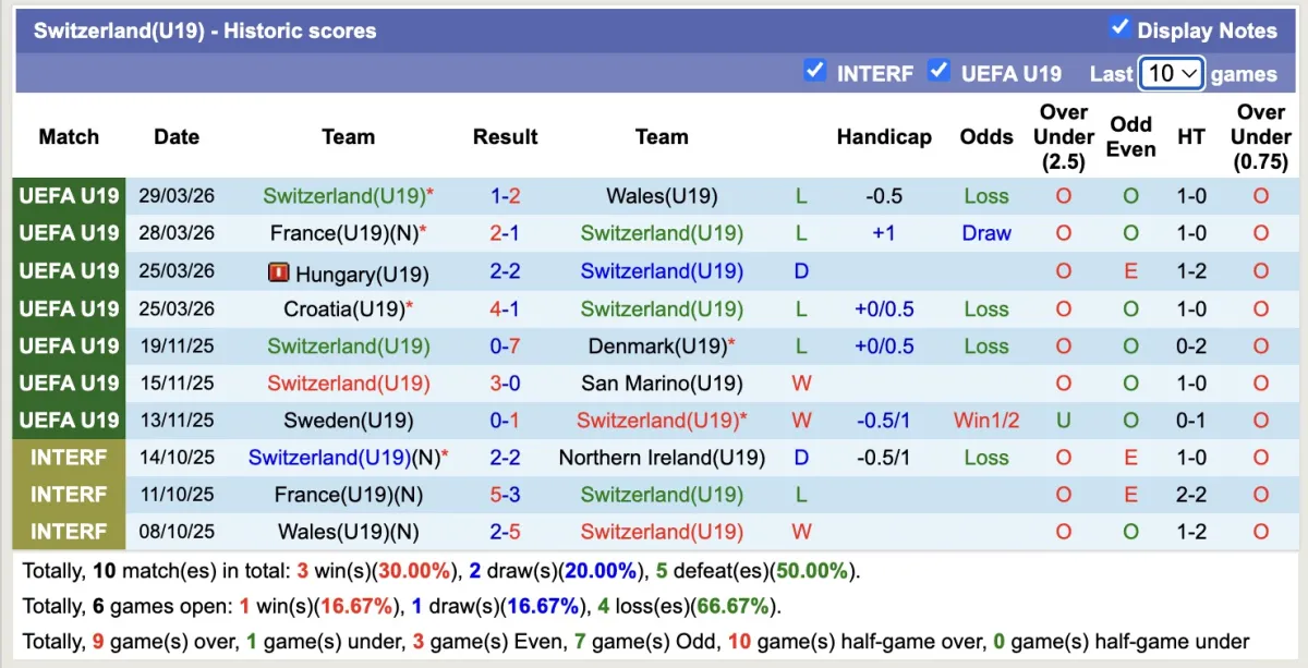 -Thống kê phong độ 10 trận đấu gần nhất của U19 Thụy Sĩ