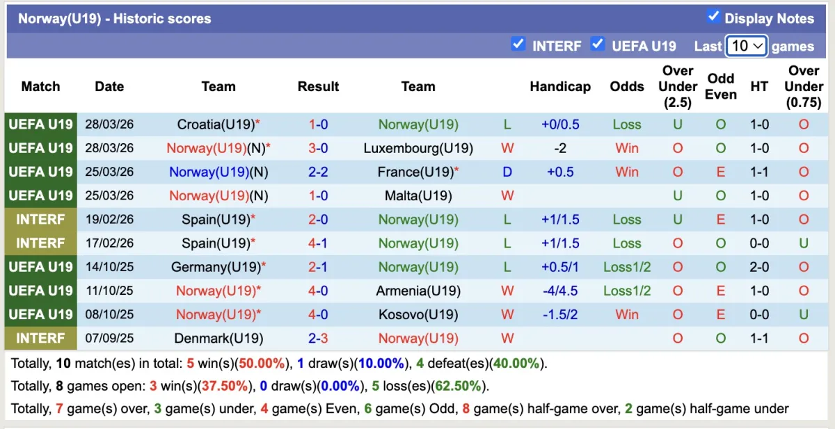 -Thống kê phong độ 10 trận đấu gần nhất của U19 Na Uy