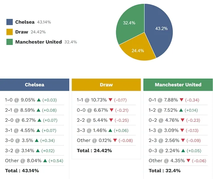 Tỷ số có khả năng cao nhất dẫn đến chiến thắng của Chelsea là 1-0 với xác suất 9,05%. Các tỷ số có khả năng xảy ra tiếp theo là 2-1 với 8,59% và 2-0 với 6,27%. Về phía Manchester United, cơ hội thắng cao nhất là với tỷ số 0-1 với 7,88%, trong khi tỷ số hòa có khả năng xảy ra nhất là 1-1 với 10,73%.
