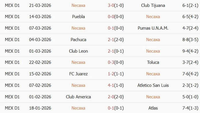 Thống kê phong độ 10 trận đấu gần nhất của Club Necaxa
