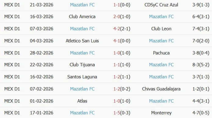 Thống kê phong độ 10 trận đấu gần nhất của Mazatlan