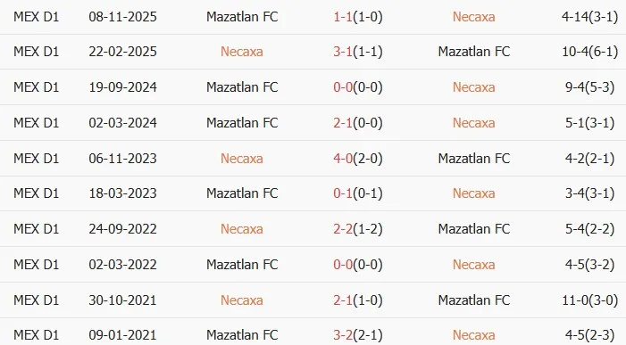 Lịch sử đối đầu Club Necaxa vs Mazatlan