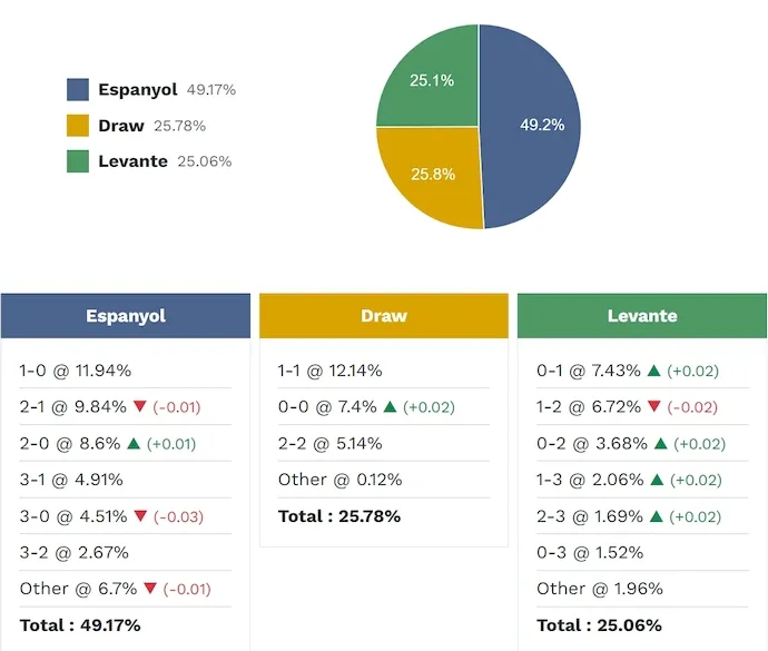 Tỷ số có khả năng xảy ra nhất để Espanyol thắng là 1-0 với xác suất 11,94%. Các tỷ số có khả năng xảy ra tiếp theo là 2-1 (9,84%) và 2-0 (8,6%). Tỷ số hòa có khả năng xảy ra nhất là 1-1 (12,14%), trong khi tỷ số thắng của Levante là 0-1 (7,43%).