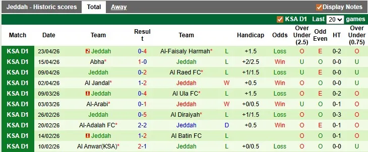 Thống kê phong độ 10 trận đấu gần nhất của Jeddah