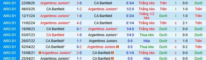 + 10/13 trận gần nhất Argentinos tiếp đón Banfield trên sân nhà cũng có 2 bàn thắng trở xuống.