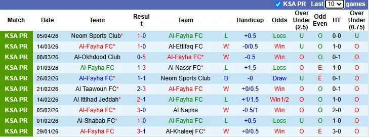 Thống kê phong độ 10 trận gần nhất của Al-Fayha
