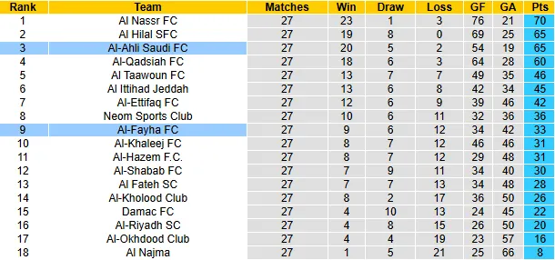Lịch sử cũng đang ủng hộ tuyệt đối đội khách khi họ toàn thắng cả 5 lần đụng độ gần nhất với Al-Fayha, ghi tới 13 bàn và chỉ để thủng lưới duy nhất 1 lần. Sự chênh lệch về chiều sâu đội hình giữa hai bên là quá rõ ràng. Al-Ahli không chỉ mạnh ở đội hình xuất phát mà các phương án dự phòng của họ cũng đủ sức tạo ra đột biến. Trong khi đó, Al-Fayha thường rơi vào thế bị động khi đối phương tăng tốc.
