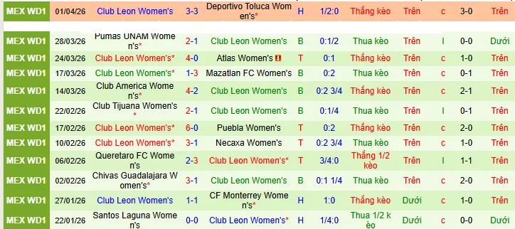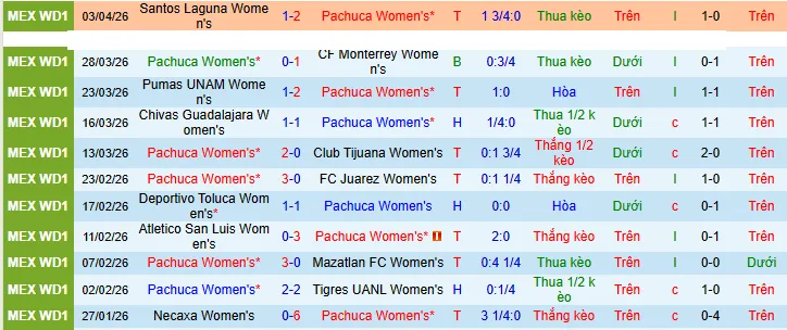 + Trên sân nhà, Nữ Pachuca thắng cả 4 trận đối đầu Nữ Leon có mở kèo châu Á.