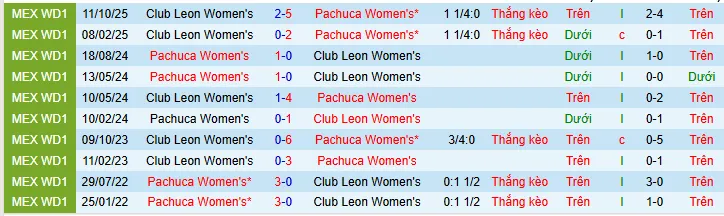 + Nữ Pachuca thắng 9 chỉ thua 1 trong 10 trận đối đầu Nữ Leon có mở kèo châu Á.