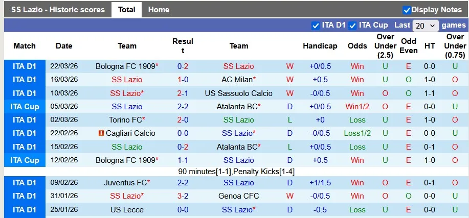 Thống kê phong độ 10 trận đấu gần nhất của Lazio