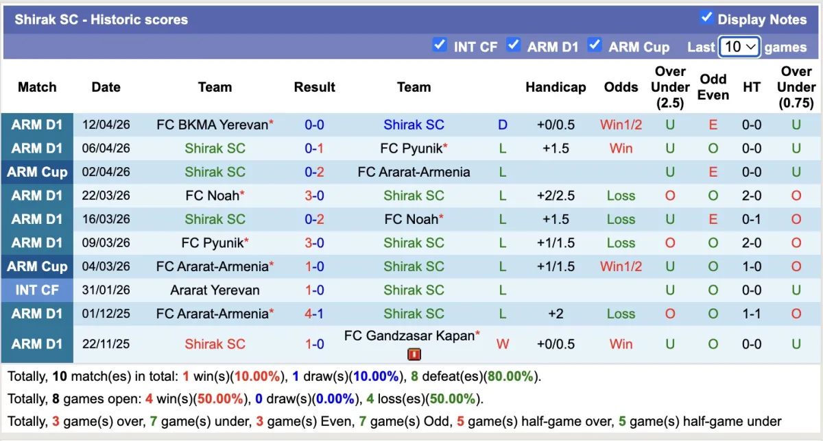 -Thống kê phong độ 10 trận đấu gần nhất của Shirak SC