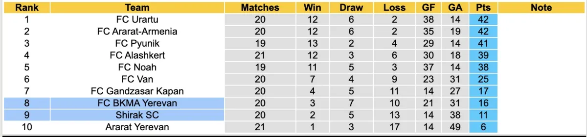 Trong khi đó bên phía đối diện khung thành, BKMA Yerevan cũng đang trải qua quãng thời gian khó khăn khi 6 trận gần đây không thắng và thua đến 4. Trên bảng xếp hạng đội khách đang xếp ngay trên đối thủ trận này với 5 điểm hơn.