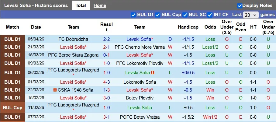 Thống kê phong độ 10 trận đấu gần nhất của Levski Sofia