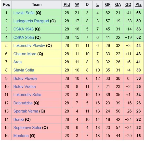 Còn 2 lượt đấu nữa, giai đoạn vòng tròn giải VĐQG Bulgria sẽ kết thúc. Lúc này, Levski Sofia đã chắc chắn có được vị trí đầu bảng bất chấp kết quả 2 trận còn lại như thế nào. Họ đang có 66 điểm, hơn 7 điểm so với đội nhì bảng (Ludogorets).