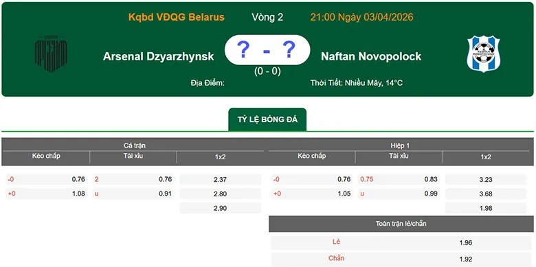 Nhận định, soi kèo Arsenal Dzerzhinsk vs Naftan Novopolotsk, 21h ngày 3/4 – Giải vô địch Belarus. Phân tích tỷ lệ kèo, dự đoán kết quả Arsenal Dzerzhinsk đấu với Naftan Novopolotsk chuẩn xác từ các chuyên gia hàng đầu BongdaNET.