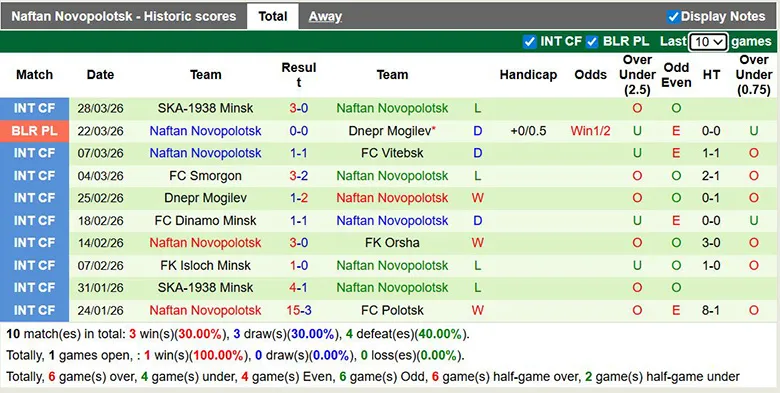 – Thống kê phong độ 10 trận đấu gần nhất của Naftan Novopolotsk