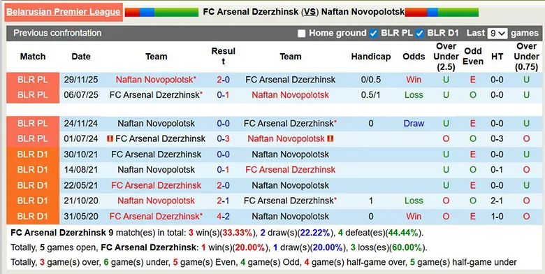 Trong 5 lần gần nhất gặp Arsenal Dzerzhinsk, Naftan Novopolotsk thắng 3, hòa 2 và không thua trận này. Họ thậm chí từng có trận thắng tưng bừng ngay trên sân khách. Điều đó cho thấy Naftan Novopolotsk mạnh hơn đối phương và có khả năng kết thúc trận đấu theo ý muốn.