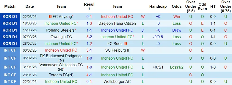 – Phân tích kết quả 10 trận gần nhất của Incheon United.