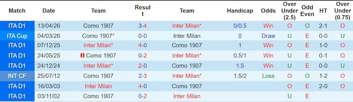 Lịch sử đối đầu cũng nghiêng mạnh về phía Inter Milan. Trong 10 lần gặp nhau gần nhất, Inter Milan thắng tới 9 trận và hòa 1. Đặc biệt trên sân nhà, Inter Milan toàn thắng cả 4 lần tiếp Como, nhiều lần với cách biệt rõ rệt.