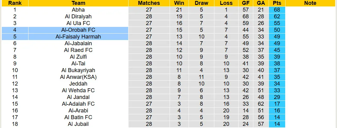 Al-Orobah và Al-Faisaly Harmah là cặp đấu đáng xem nhất vòng 28 giải hạng Nhất Saudi Arabia khi cả hai đang có phong độ tốt và còn nguyên cơ hội cạnh tranh vé thăng hạng. Được biết, Al-Orobah đang đứng ở vị trí thứ 4 với 50 điểm và đây là vị trí được tham dự loạt trận play off thăng hạng. Dù vậy, họ vẫn cần thận trọng khi hơn đội xếp thứ 7 Al Raed khoảng cách 5 điểm. Bên kia sân, Al-Faisaly Harmah cũng ở tình cảnh tương tự khi xếp ở vị trí thứ 5 với 49 điểm. Nếu thi đấu mất tập trung ở những vòng đấu cuối cùng, Al-Faisaly Harmah hoàn toàn có thể bị đánh bật khỏi top 6 và mất vé tham dự play off thăng hạng.