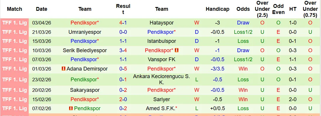 Thống kê phong độ 10 trận đấu gần nhất của Pendikspor