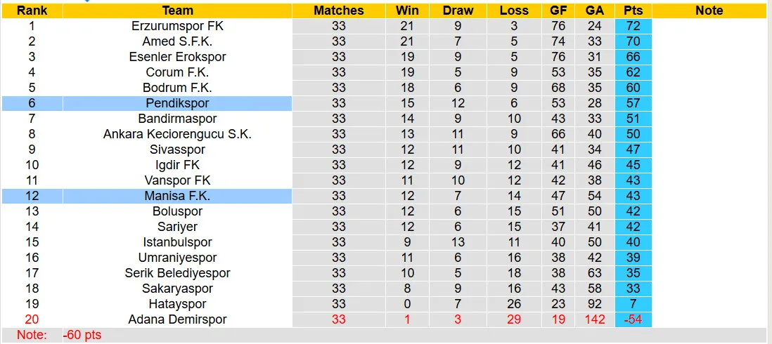 Manisa đang có dấu hiệu mất tập trung về phong độ khi thua liên tiếp 3 trận đấu vừa rồi tại giải hạng Nhất Thổ Nhĩ Kỳ. Tuy nhiên, Manisa cũng không quá lo lắng khi họ đang duy trì được khoảng cách an toàn về điểm số trước nhóm cầm đèn đỏ của giải đấu. Cụ thể, họ đang có được 43 điểm sau 33 trận và hơn đội cầm đèn đỏ tới 8 điểm. Dự đoán, chuỗi phong độ nghèo nàn sẽ còn tiếp diễn nếu còn duy trì tâm lý thi đấu chủ quan và hời hợt.