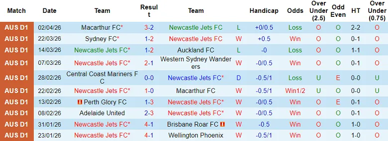 Thống kê kết quả 10 trận gần nhất của Newcastle Jets cho thấy phong độ không ổn định của đội bóng này.