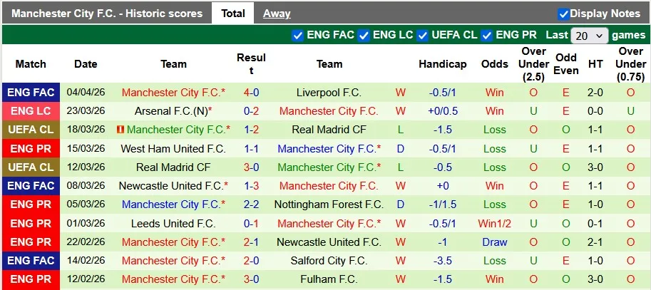 Thống kê phong độ 10 trận đấu gần nhất của Man City