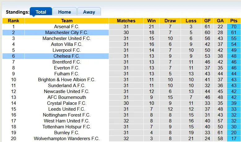 Chelsea hiện chỉ kém 1 điểm so với đội xếp trên là Liverpool, trong khi Man City vẫn đang cạnh tranh vô địch với Arsenal. The Citizens đang kém đối phương 9 điểm, nhưng họ vẫn còn 2 trận chưa đấu.