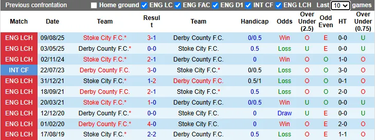 Lịch sử đối đầu Derby County vs Stoke City