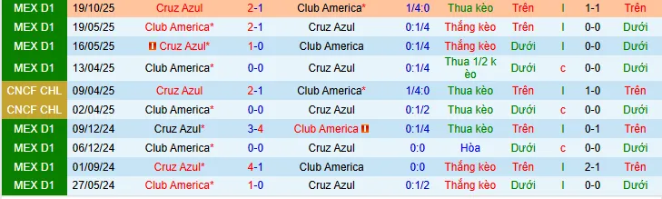 + Club America thắng 3 hòa 1 thua 6 trong 10 trận đối đầu gần nhất với Cruz Azul theo kèo châu Á.