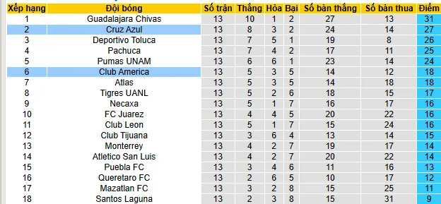 + Club America thắng 7 thua 3 trong 10 trận sân nhà vừa qua ở giải VĐQG.