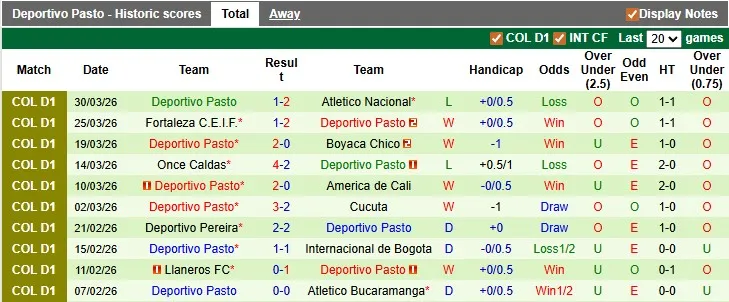 Thống kê phong độ 10 trận đấu gần nhất của Deportivo Pasto