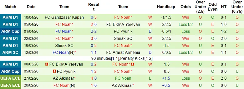 Thống kê kết quả 10 trận gần nhất của FC Noah cũng giúp đánh giá khả năng của đội bóng này.