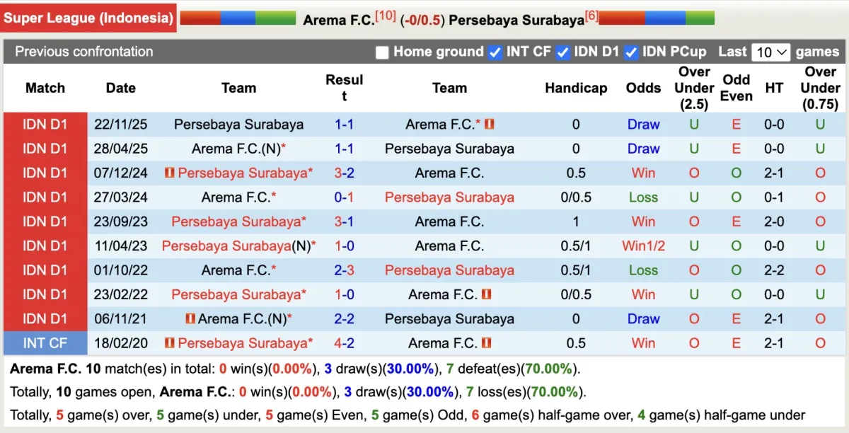 Nhà cái đánh giá Arema nhỉnh hơn trong trận đấu này, tuy nhiên, lịch sử đối đầu giữa hai đội từ năm 2020 đến nay cho thấy Arema chưa bao giờ thắng kèo và thua kèo tới 7 trận. Điều này cho thấy Persebaya Surabaya vẫn là một lựa chọn uy tín.