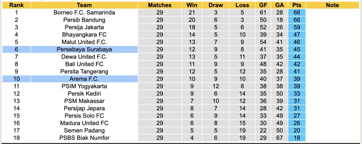 Hiện tại, sau 29 vòng đấu, Persebaya Surabaya đã tích lũy được 45 điểm và đứng ở vị trí thứ 6 trên bảng xếp hạng. Với 5 vòng đấu còn lại, đội bóng này vẫn có cơ hội để lọt vào nhóm AFC Challenge League, một mục tiêu đầy tham vọng.