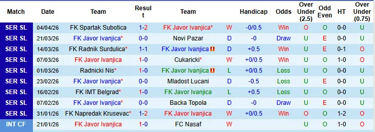 Thống kê phong độ 10 trận đấu gần nhất của Javor Ivanjica
