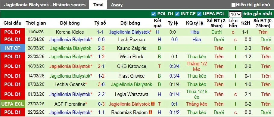 Thống kê phong độ 10 trận đấu gần nhất của Jagiellonia