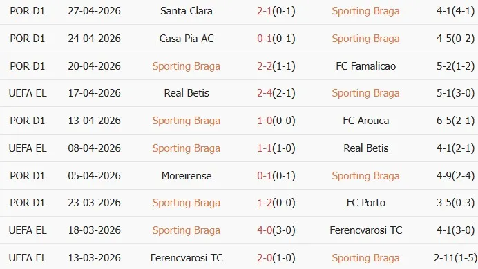 Thống kê phong độ 10 trận đấu gần nhất của Braga