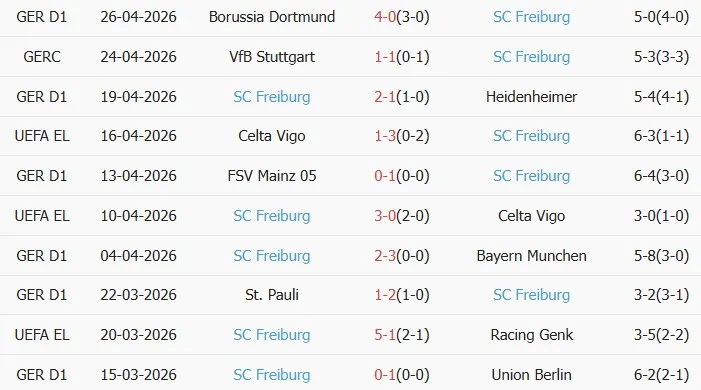 Thống kê phong độ 10 trận đấu gần nhất của Freiburg