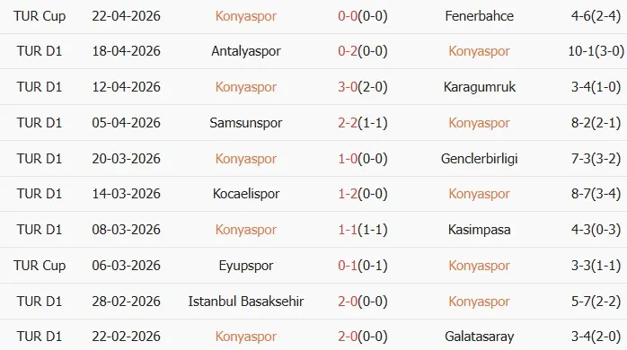 Thống kê phong độ 10 trận đấu gần nhất của Konyaspor