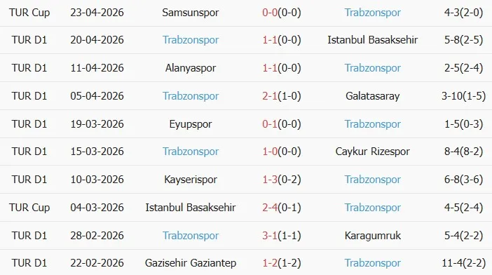 Thống kê phong độ 10 trận đấu gần nhất của Trabzonspor