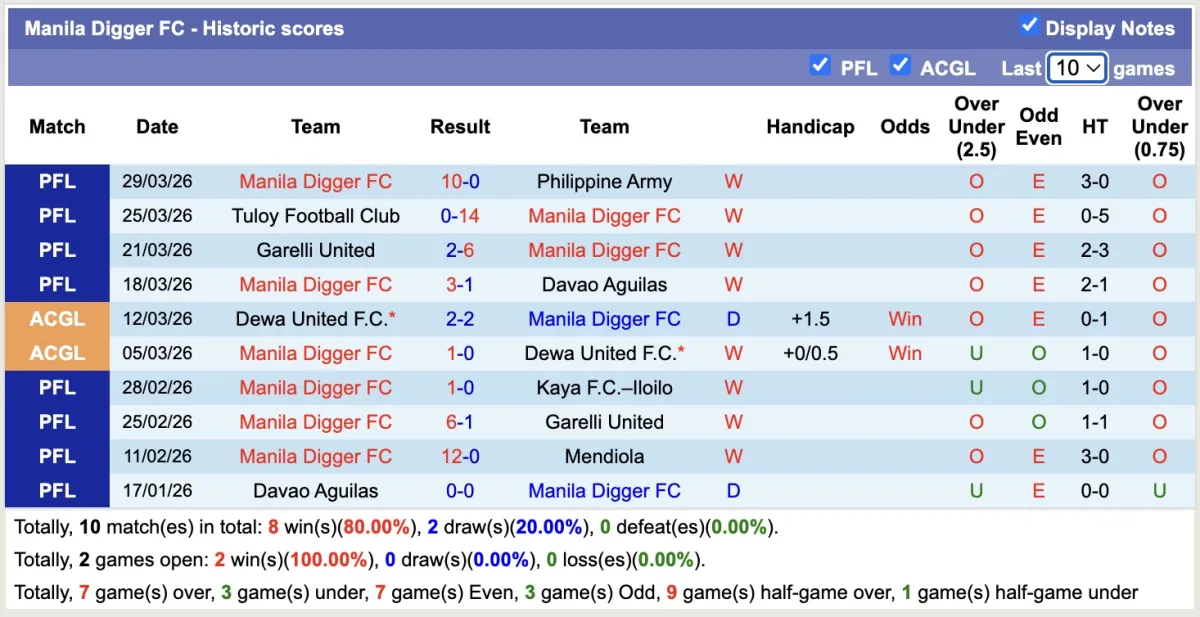 -Thống kê phong độ 10 trận đấu gần nhất của Manila Digger