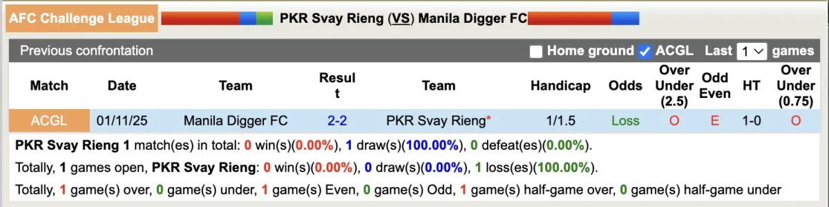 Ở lần đối đầu giữa hai câu lạc bộ vào tháng 11 năm 2025 tại AFC Challenge League. Manila Digger đã có một ngày thi đấu đầy bản lĩnh. Mặc dù bị đánh giá thấp hơn đối thủ khá nhiều nhưng đại diện Philippines đã giành 1 điểm.