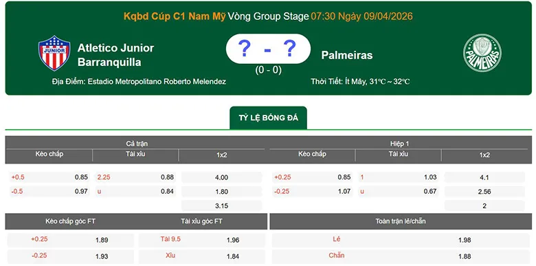 Nhận định, soi kèo Junior vs Palmeiras, 7h30 ngày 9/4 – Giải Copa Libertadores. Phân tích tỷ lệ kèo, dự đoán kết quả Junior đấu với Palmeiras chuẩn xác từ các chuyên gia hàng đầu BongdaNET.