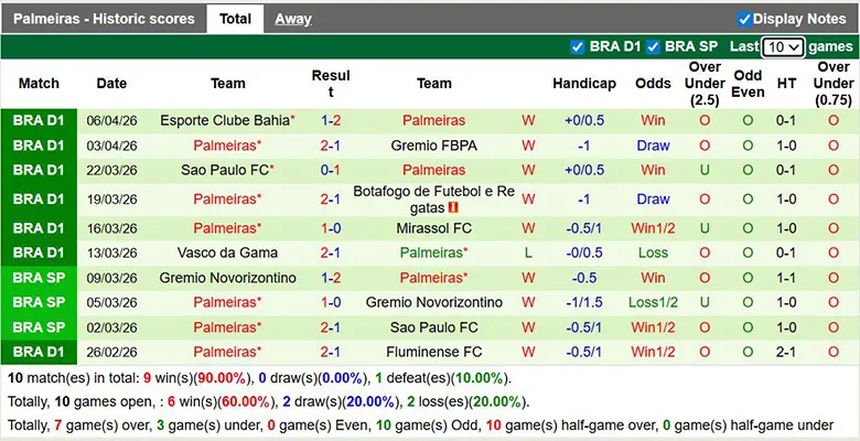 – Thống kê phong độ 10 trận đấu gần nhất của Palmeiras