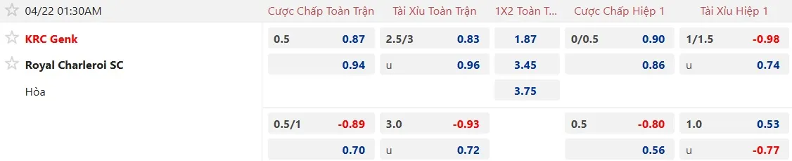 Sàn giao dịch châu Á ghi nhận mức kèo Genk chấp 1/2 trái, mức kèo đã giúp họ đánh bại Sporting Charleroi với tỷ số tối thiểu trong trận đối đầu gần nhất, và với việc Sporting Charleroi để thua kèo châu Á 10/11 trận vừa qua trên mọi đấu trường, Genk với ưu thế sân nhà nhiều khả năng sẽ khiến đối thủ ôm hận.