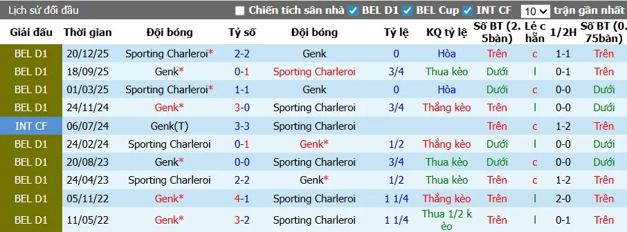 Lịch sử đối đầu Genk vs Sporting Charleroi.