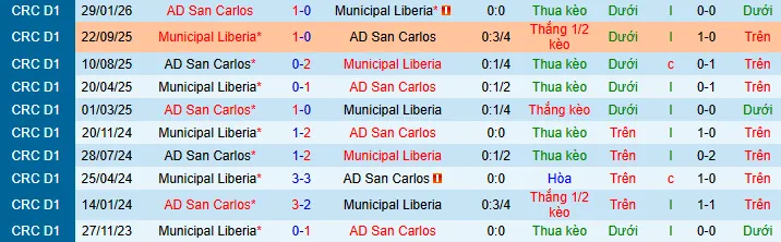 Kể từ tháng 11 năm 2024, hai đội đã đối đầu nhau sáu lần. Municipal Liberia thắng hai trận, San Carlos thắng ba trận, và trận còn lại hòa. Liberia ghi được ba bàn thắng trong sáu lần gặp nhau này, trong khi San Carlos cũng ghi được ba bàn. Vì vậy, nhìn chung, hai đội có thành tích khá cân bẵng những năm gần đây.
